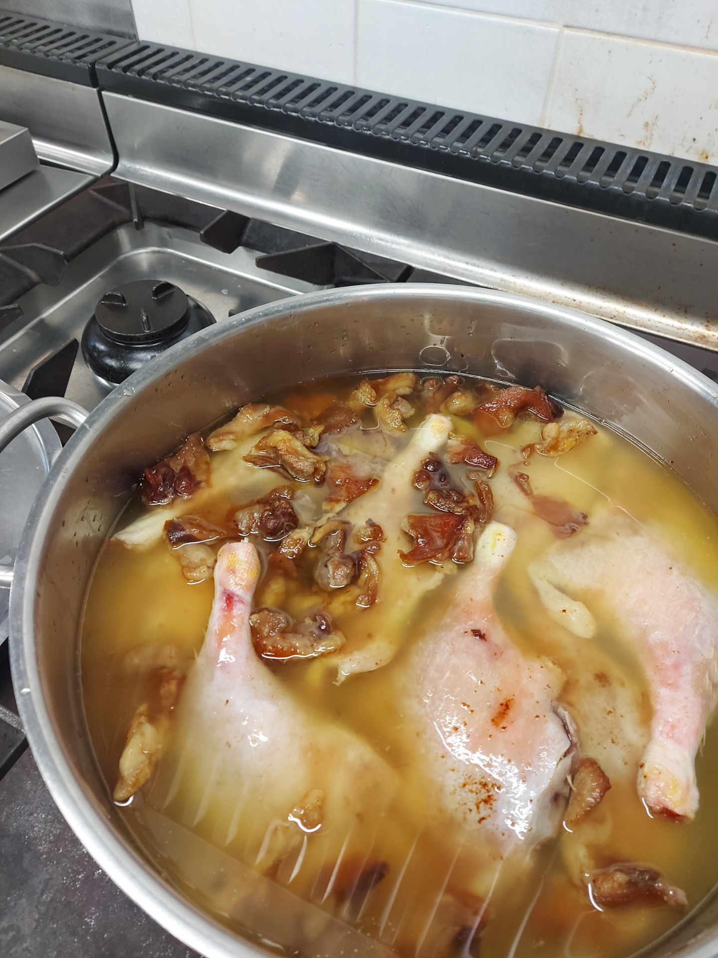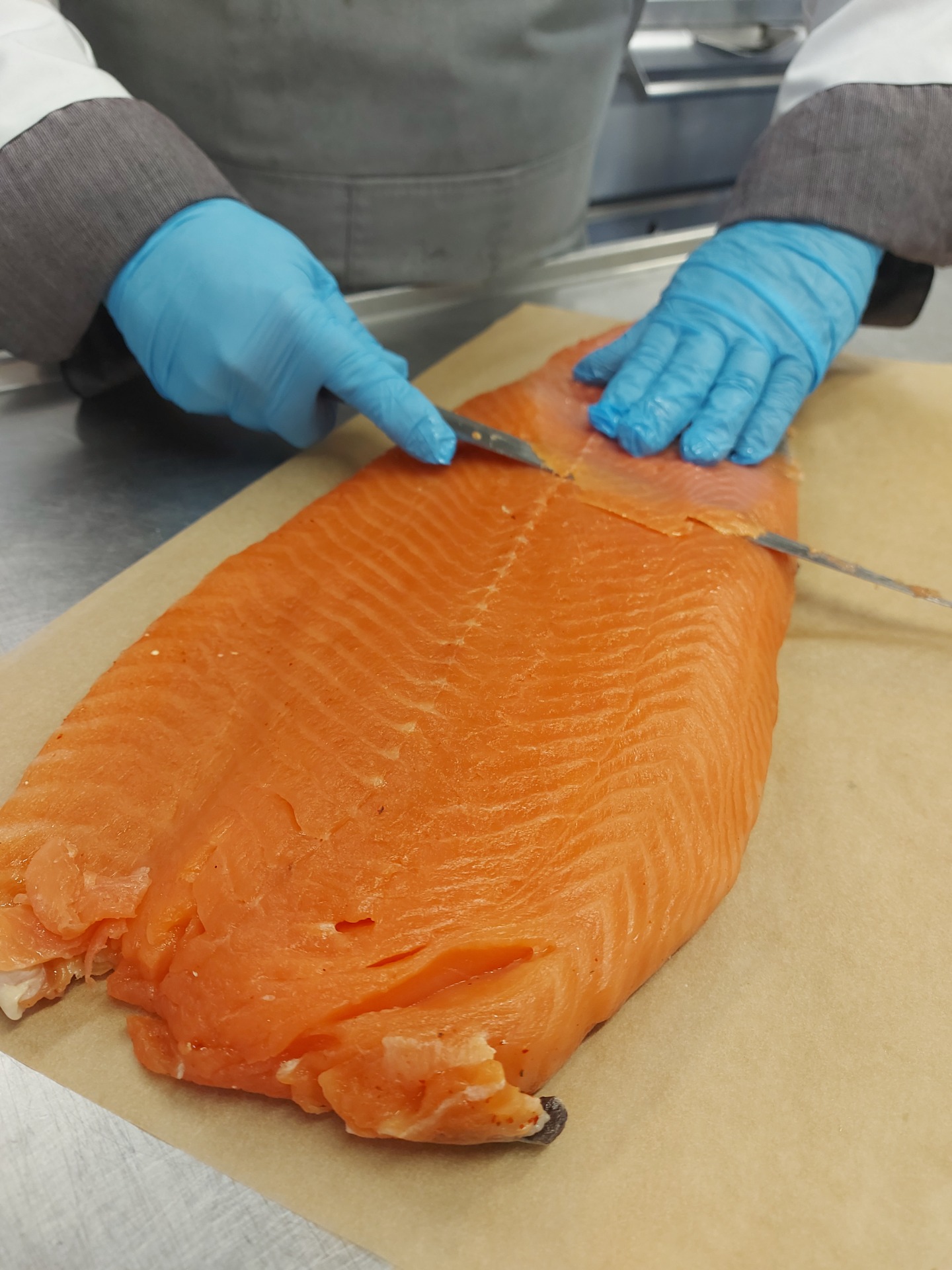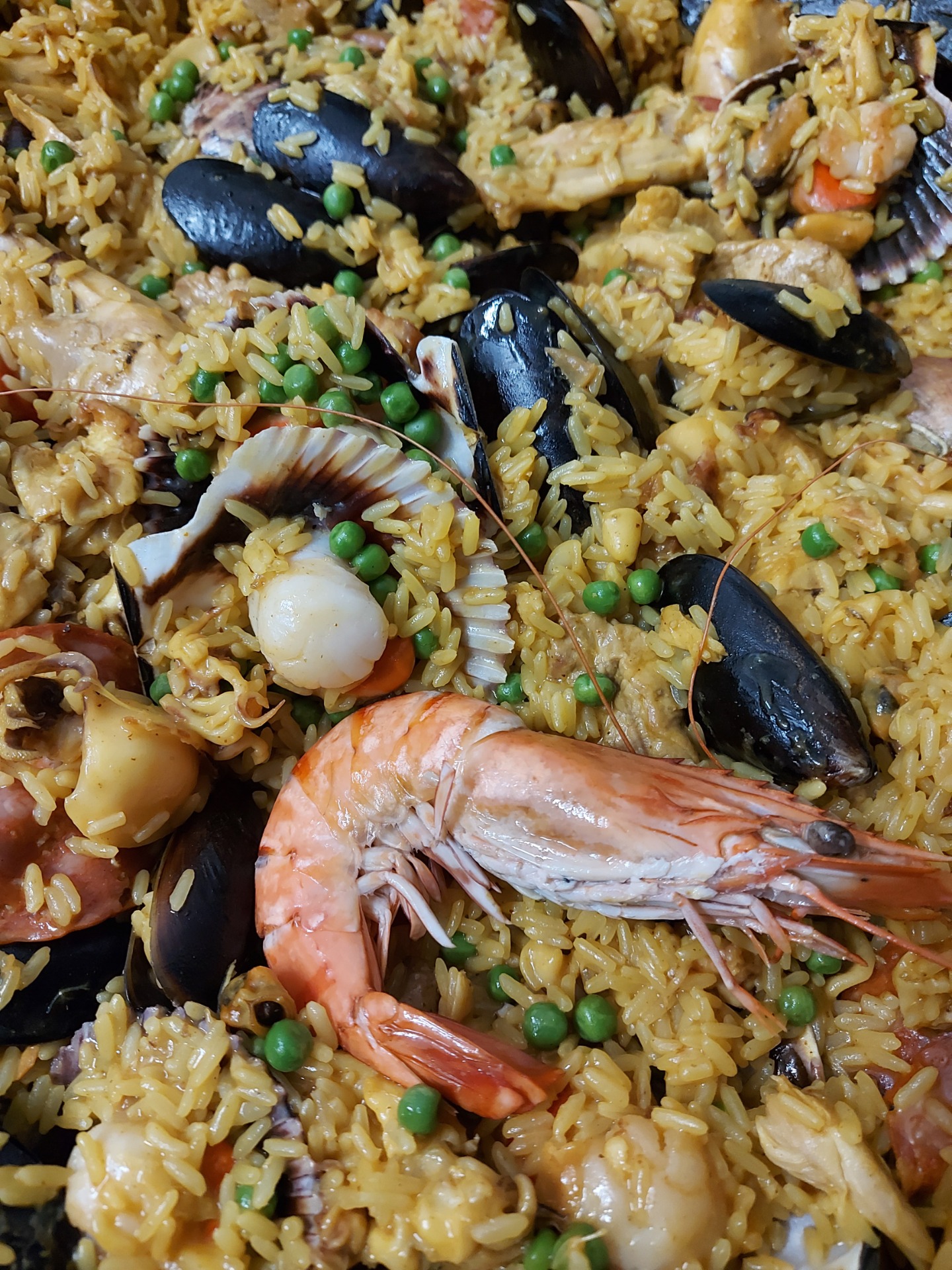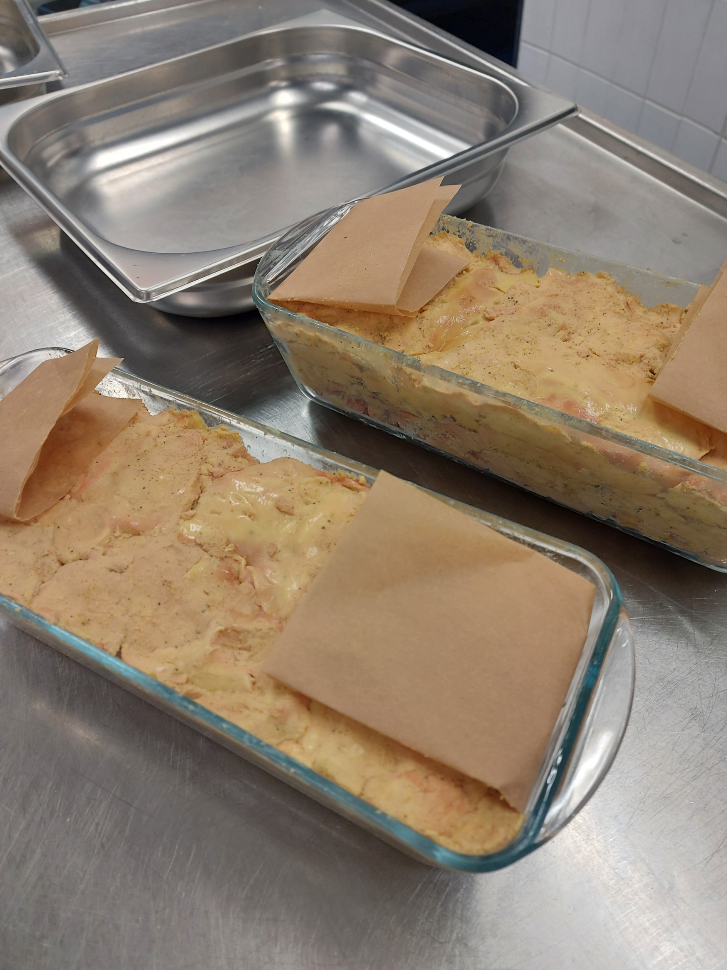 paëlla, saumon fumé maison, terrine de foie gras en préparation, confit de canard gras en cuisson, et tourte de caillette au foie gras en sorti de four